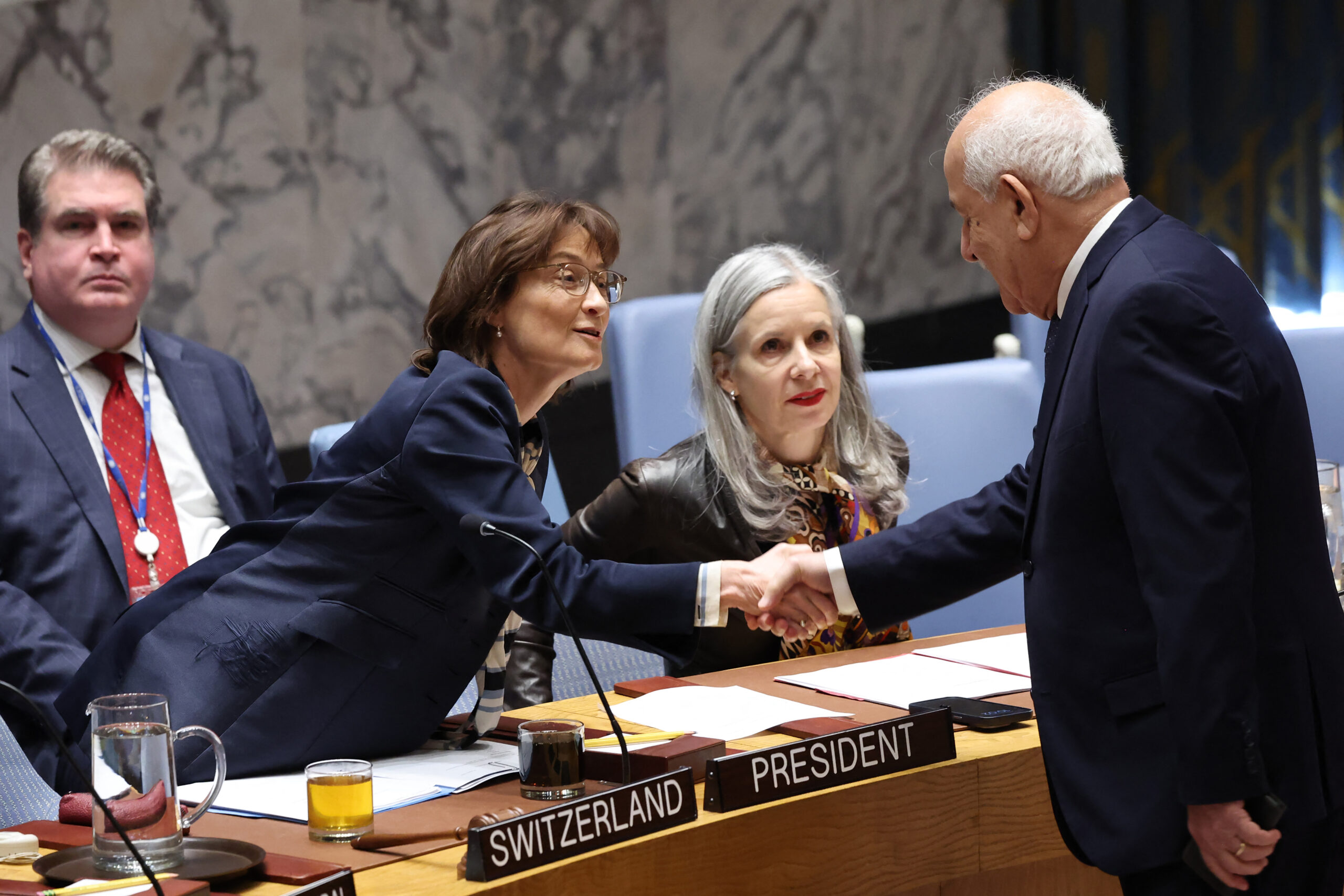 NEW YORK, NEW YORK - OCTOBER 16: Ambassador Pascale Baeriswyl, Permanent Representative of Switzerland to the UN and President of the Security Council for the month of October, shakes hands with Riyad Mansour, Palestinian Ambassador to the UN, during a United Nations Security Council meeting on the situation in the Middle East, including the Palestinian question on October 16, 2024 in New York City. The Security Council held a meeting on the ongoing war between Israel and Hamas a day after the Biden administration warned Israel to improve the humanitarian situation in Gaza or risk a cut to arms sales. The threat is the strongest stance the Biden administration has taken since the war began last year. Michael M. Santiago/Getty Images/AFP (Photo by Michael M. Santiago / GETTY IMAGES NORTH AMERICA / Getty Images via AFP)